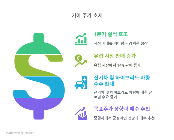 2025년 1월 24일, 대신증권은 기아의 목표주가를 15만 원으로 하향했으나 여전히 매수 의견을 유지하며 긍정적인 전망을 제시했다. 이는 2025년 예상 EPS 24,209원에 기반한 것으로, 기아의 안정적인 실적과 글로벌 시장 확대 가능성을 반영한다. 또한, 하반기 상승 반전 가능성이 제기되며 투자자들의 관심이 커지고 있다. 이러한 긍정적인 증권사 전망은 기아의 주가 안정성과 투자 매력을 높이며, 단기적인 주가 반등과 장기적인 성장 기대감을 강화하는 호재로 작용한다.