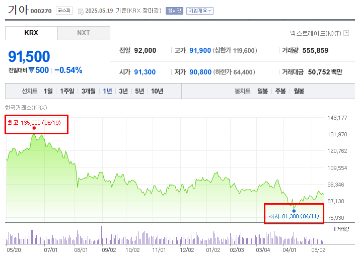 - 결론적으로, 기아의 주가는 2024년 6월 최고점 이후 2025년 4월 초까지 지속적인 하락 추세를 나타내며 큰 폭으로 하락했다. 이후 2025년 4월 중순부터 5월까지는 하락세를 멈추고 소폭 상승하는 모습을 보였으나, 이전의 하락 폭을 완전히 회복하지는 못했다. 따라서 해당 기간 동안 기아의 주가는 장기적인 하락 추세 속에서 마지막 시점에 제한적인 반등을 보이는 흐름이었다고 분석할 수 있다.