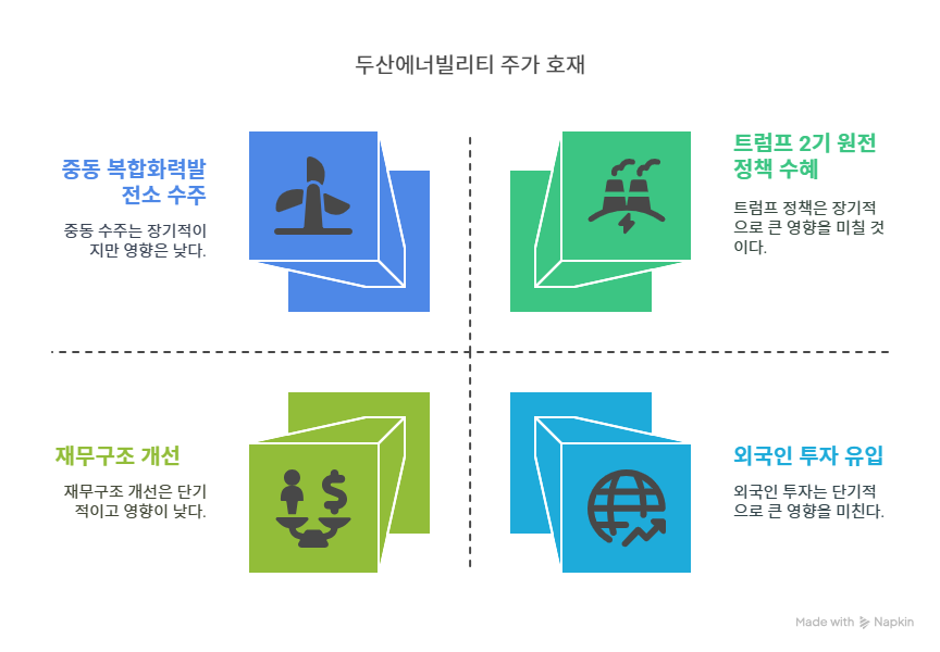 2025년 국내 정치적 불안정성이 두산에너빌리티에 악재로 작용했다. 유튜브 채널 팩트TV는 나스닥 급락과 대통령 탄핵 이슈가 주가 하락 요인이라고 분석했다. 2025년 1분기 주가가 일시적으로 5% 하락하며 투자 심리가 위축되었다. 특히, 원전 정책의 예산 지원이 정치적 갈등으로 지연될 가능성이 제기되며, 두산의 SMR 사업에 불확실성이 커졌다. 이는 단기적으로 주가와 투자 심리에 부정적인 영향을 미친다.