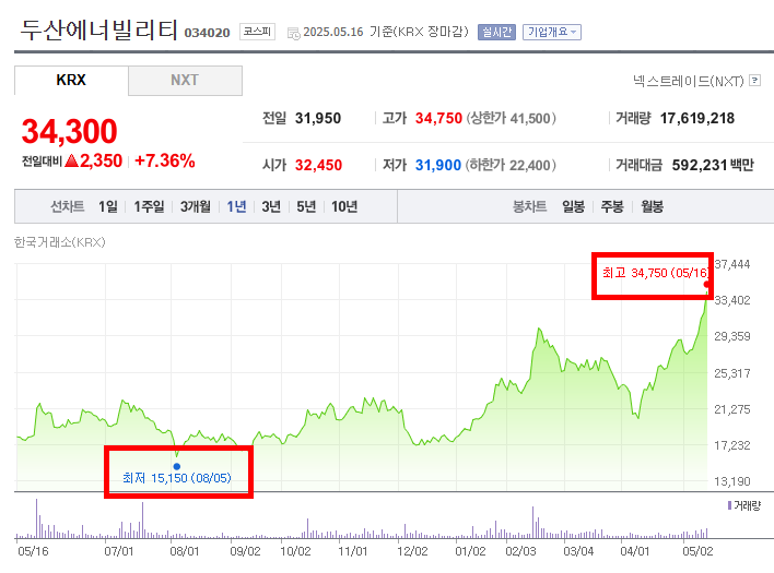 - 최저점을 기록한 이후 주가는 뚜렷한 상승세로 전환되었다. 특히 2024년 12월부터 상승폭이 확대되며 가파르게 상승하는 모습을 보였다. 2025년 5월 16일에는 최고점인 34,750원을 기록하며 1년 중 가장 높은 주가를 형성했다. 이 급격한 상승은 에너지 시장의 변화, 원자력 발전 관련 정책, 또는 기업의 수주 증가 등 다양한 요인에 의해 견인되었을 수 있다.