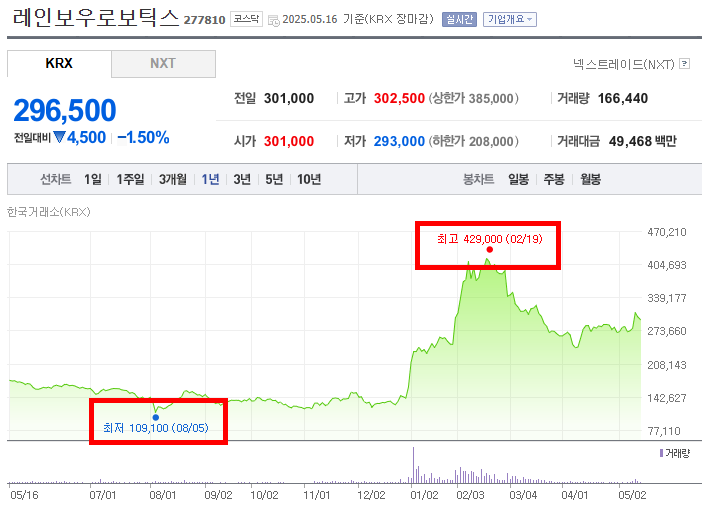 • 최저점을 기록한 이후 주가는 횡보하는 듯 보였으나, 2025년 1월부터 매우 가파르게 상승하기 시작했다. 특히 2025년 2월에는 폭발적인 상승세를 보이며 2월 19일에 최고점인 429,000원까지 급등했다. 이는 로봇 산업에 대한 높은 성장 기대감, 레인보우로보틱스의 기술력 부각, 또는 시장의 긍정적인 평가 등이 복합적으로 작용한 결과로 추정된다.
