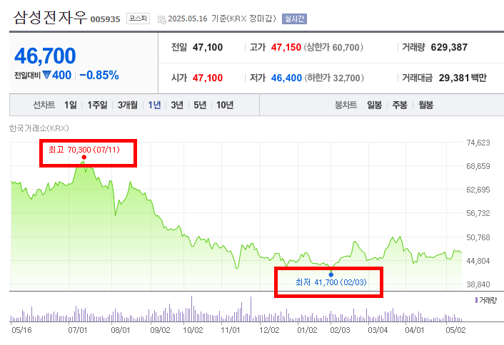 - 최저점을 기록한 이후 주가는 등락을 반복하는 모습을 보이다가 2025년 4월부터 소폭 상승하는 추세를 나타내고 있다. 2025년 5월 16일 종가는 46,700원으로, 최저점 대비 소폭 상승했지만 여전히 1년 전 최고가에 비해서는 낮은 수준이다.