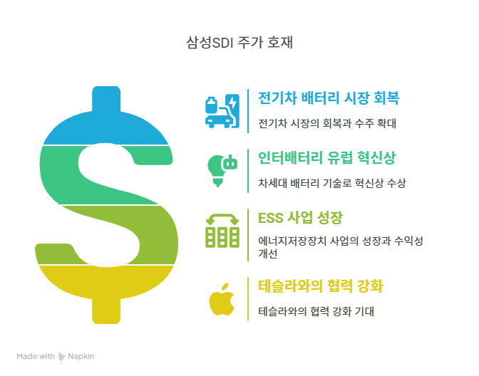 2025년 들어 전기차 배터리 시장이 회복세를 보이며 삼성SDI의 성장 가능성이 부각되고 있다. 글로벌 전기차 수요 증가와 함께 삼성SDI의 고성능 배터리 기술이 주목받고 있다. 특히, 유럽과 북미 시장에서 전기차 보급 확대 정책이 삼성SDI의 배터리 수주로 이어지고 있다. 2025년 2월 유튜브 보도에 따르면, 삼성SDI와 LG에너지솔루션이 2차전지 업계의 호재로 주목받으며, 삼성SDI는 테슬라와의 협력 강화 가능성이 제기됐다. 이는 매출 성장과 주가 반등의 주요 요인으로 작용한다. 삼성SDI의 기술 경쟁력은 장기적인 시장 점유율 확대를 기대하게 한다.