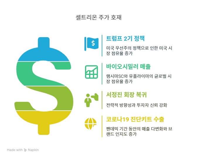 셀트리온은 트럼프 2기 정부의 미국 우선주의 정책으로 수혜를 받을 전망이다. 2025년 4월 19일 메디파나 보도에 따르면, 셀트리온은 바이오시밀러와 CDMO 사업이 미국 내 수요 증가로 호재를 맞았다. 트럼프 정부의 의약품 국산화 정책은 셀트리온의 미국 시장 점유율 확대에 기여한다. 또한, 원/달러 환율 상승은 수출 중심인 셀트리온의 매출에 긍정적인 영향을 미친다. 이는 매출 다변화와 수익성 강화를 가져오며, 주가 상승과 투자자 신뢰를 높이는 주요 동력으로 작용한다.