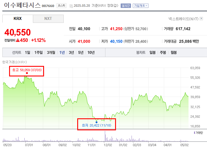 2024년 11월 18일부터 2025년 5월 19일까지: 2024년 11월 18일 최저점을 찍은 후, 주가는 강력한 상승세로 전환되었다. 12월과 2025년 1월에 걸쳐 꾸준히 상승하였고, 2월과 3월에도 상승 폭을 확대하며 높은 고점을 형성하였다. 4월에는 잠시 조정을 거쳤으나, 5월 초부터 다시 상승하여 5월 19일 기준 40,550원을 기록하며 분석 기간을 마무리하였다.