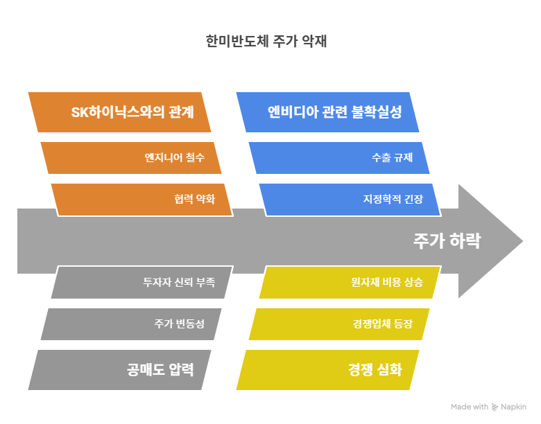 한미반도체는 SK하이닉스와의 관계 악화로 큰 악재에 직면했다. 2025년 4월 파이낸셜뉴스 보도에 따르면, SK하이닉스가 한미반도체의 TC 본더 장비 다변화를 검토하며 8년 동맹에 균열이 생겼다. 한미반도체는 SK하이닉스 엔지니어 철수에 반발하며 기업설명회를 돌연 취소했다. 이는 매출 의존도가 높은 SK하이닉스와의 협력 약화로 이어질 가능성이 크며, 단기적인 주가 하락과 투자 심리 위축을 초래했다.