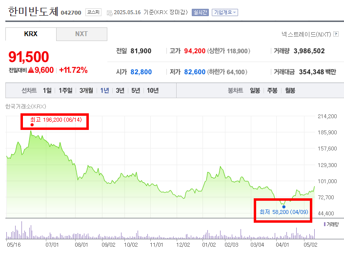 한미반도체 주가 52주 변화