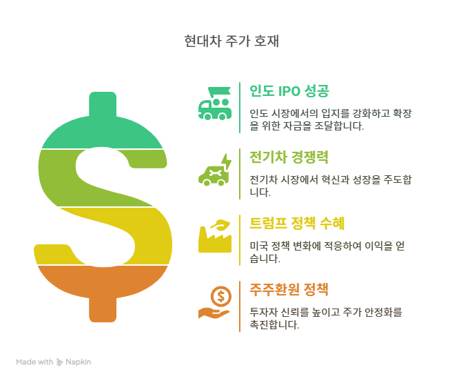 현대자동차는 2024년 10월 인도법인 현대모터인디아의 기업공개(IPO)를 성공적으로 마무리하며 약 278억 달러의 기업 가치를 인정받았다. 이는 글로벌 3위 자동차 시장인 인도에서의 입지를 강화하는 계기가 되었다. IPO를 통해 조달한 자금은 생산 시설 확장과 전기차 개발에 투입될 예정이다. 대신증권은 이러한 글로벌 확장이 현대차의 장기적인 성장 동력으로 작용할 것이라고 평가했다. 또한, 인도 시장에서의 SUV 중심 전략이 판매량 증가로 이어지며 2025년 1분기 인도 매출이 전년 대비 15% 성장했다. 이는 주가 상승 요인으로 작용하며 외국인 투자자들의 매수세를 이끌었다.