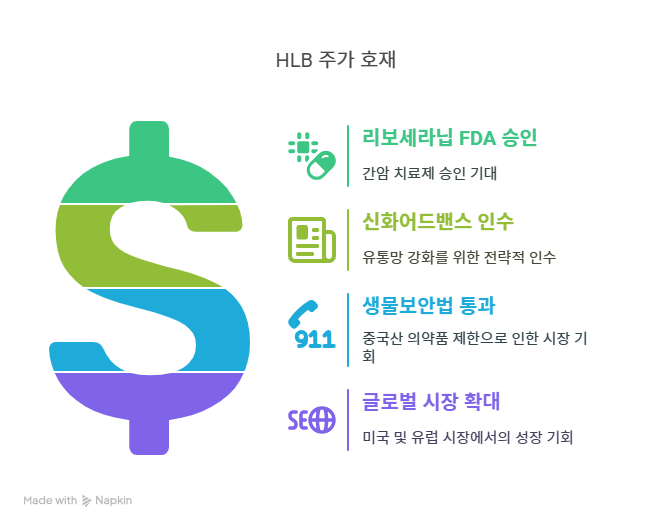 2025년 미국 생물보안법(Biosecure Act) 통과 가능성은 HLB에 긍정적인 영향을 미친다. 이 법안은 중국산 의약품 및 바이오 관련 제품의 미국 내 유통을 제한하며, HLB와 같은 국내 제약사에 새로운 시장 기회를 제공한다. 2025년 유튜브 보도에 따르면, 생물보안법 통과는 HLB의 신약 수출 확대와 시장 점유율 증가로 이어질 가능성이 높다. 이는 특히 리보세라닙의 FDA 승인 기대감과 맞물려 HLB의 글로벌 경쟁력을 강화하며, 주가 상승과 투자자 관심을 높이는 호재로 작용한다.