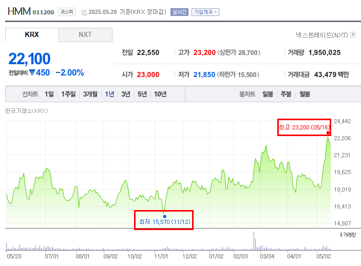 전반적으로 HMM의 주가는 2024년 하반기에 하락세를 보이다가 2024년 11월을 기점으로 반등하여 2025년 상반기에는 최고가를 경신하는 등 뚜렷한 상승 흐름을 나타냈습니다. 하지만 2025년 3월 이후 다시 조정 국면에 진입한 모습이다.