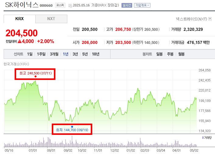 • 최저점을 기록한 후 주가는 다시 상승세를 보이기 시작하여 2025년 1월까지 꾸준히 회복하는 모습을 나타냈다. 이후에는 등락을 반복하며 변동성이 큰 흐름을 이어갔다. 2025년 5월 16일 종가는 204,500원으로, 1년 전 대비 상승한 수준이지만 최고점에는 미치지 못한다.